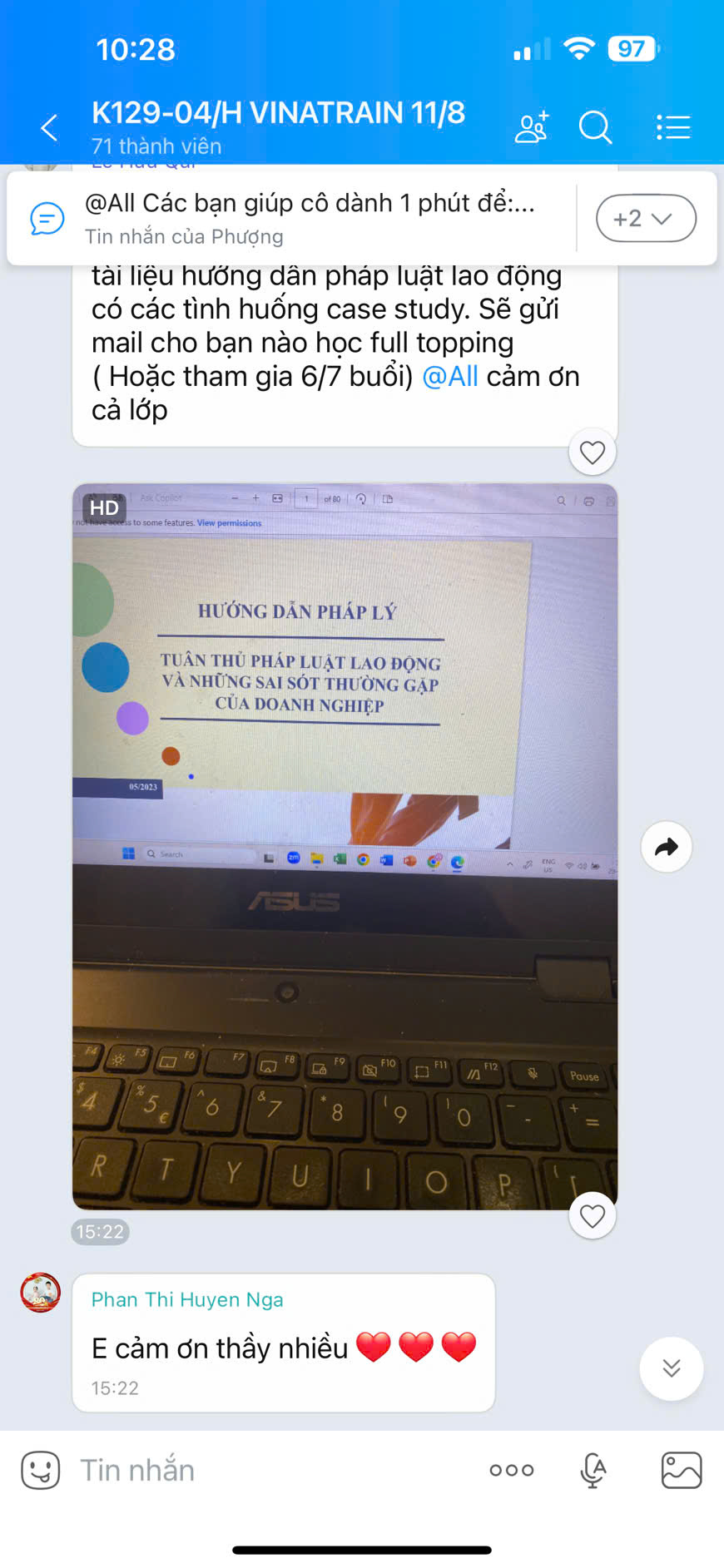 Cảm ơn trung tâm em đã nhận được giáo trình trung tâm gửi chuyển phát nhanh rồi nhé. Vào muộn 3 buổi nhưng trung tâm làm việc rất chuyên nghiệp. các bạn tư vấn thân thiện. Thầy cô dạy online rất nhiệt huyết,trong lớp mình mọi người hỏi nhiều mà cô vẫn hỗ trợ dạy quá giờ, rất hài lòng dù học online không tới trực tiếp trung tâm học được. Xong khoá học C&B này nhất định sẽ học thêm ở VinaTrain nếu có nhu cầu nhé.