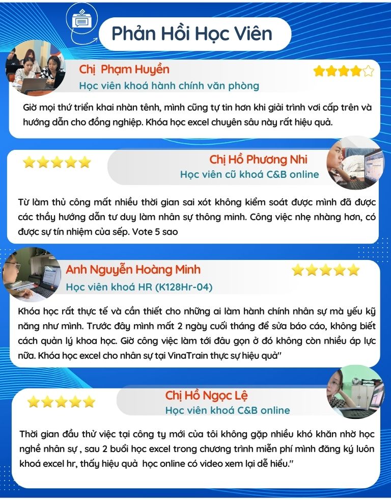 Học thêm mấy hàm liên quan đến tính lương, báo cáo thì làm lương, chế độ phúc lợi nhanh hơn và chuyên nghiệp hơn giảm bớt rất nhiều thời gian của mình để sắp xếp làm việc khác, sếp cũng đánh giá cao hơn. Mình từng học tại Trung tâm Vinatrain cuối năm 2023 giờ làm việc cảm giác tự tin hơn hẳn, hiệu quả nếu biết excel và vận dụng trong công việc đó