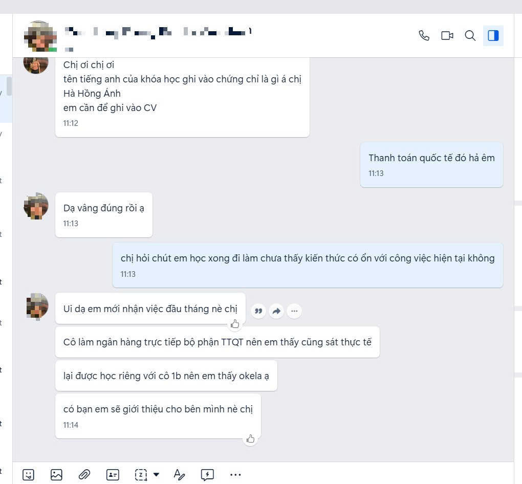 Gửi em phản hồi của học viên về lớp Thanh toán quốc tế nhé.