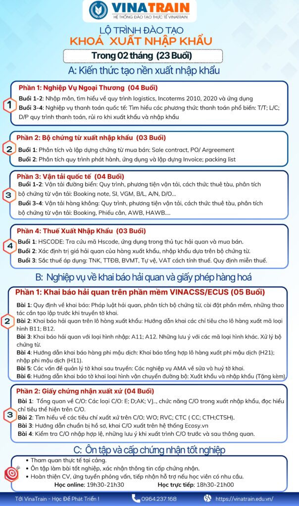 Với thời lượng từ 23 -25 buổi, thời lượng 2 tiếng/ buổi, dưới đây là sơ bộ nội dung đào tạo trong khoá xuất nhập khẩu online tại VINATRAIN