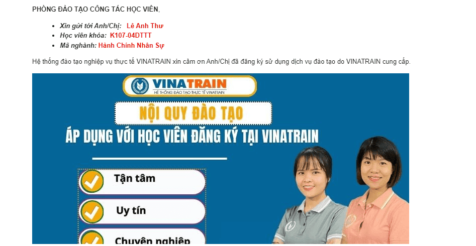 Qua bài viết này, rất cảm ơn các học viên đã luôn đồng hành, tin tưởng khi chọn Trung tâm VinaTrain làm nơi bổ sung nghiệp vụ, kiến thức cho hành trang sau này trên con đường tương lai.Xin cảm ơn Ms Thanh Mai đã có những chia sẻ chân thành với độc giả giúp minh bạch thông tin trung tâm hành chính nhân sự VinaTrain lừa đảo.